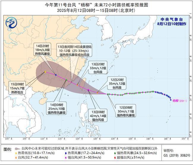 预计,“杨柳”将以每小时25公里左右的速度向偏西方向移动,强度逐渐加强,最强可达强台风级(42~48米/秒,14~15级),将于13日中午前后在台湾东南部沿海登陆(台风级或强台风级,38~45米/秒,13~14级),穿过台湾岛后进入台湾海峡,强度逐渐减弱,并将于13日夜间至14日凌晨在福建南部到广东东部一带沿海再次登陆(强热带风暴级或台风级,25~33米/秒,10~12级);也不排除经过台湾岛南部海面,在闽粤交界一带沿海登陆的可能。